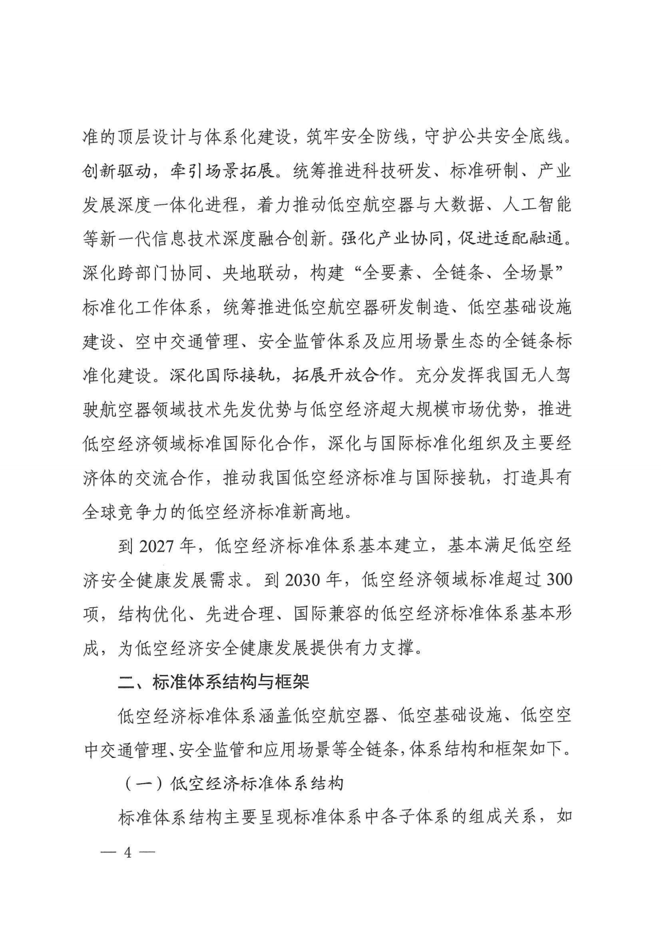 指南重点围绕低空航空器、低空基础设施、低空空中交通管理、安全监管和应用场景五大核心领域,构建技术标准与管理规范融合、国内标准与国际规则融合、强制性标准与推荐性标准融合、基础标准与场景标准融合的“四维融合”标准供给体系。指南明确提出分阶段目标:到2027年,低空经济标准体系基本建立;到2030年,相关标准超过300项,基本形成结构优化、先进合理、国际兼容的低空经济标准体系。指南的发布标志着我国低空经济从自由探索迈向规范发展的新阶段,为产业安全健康发展提供了有力支撑。