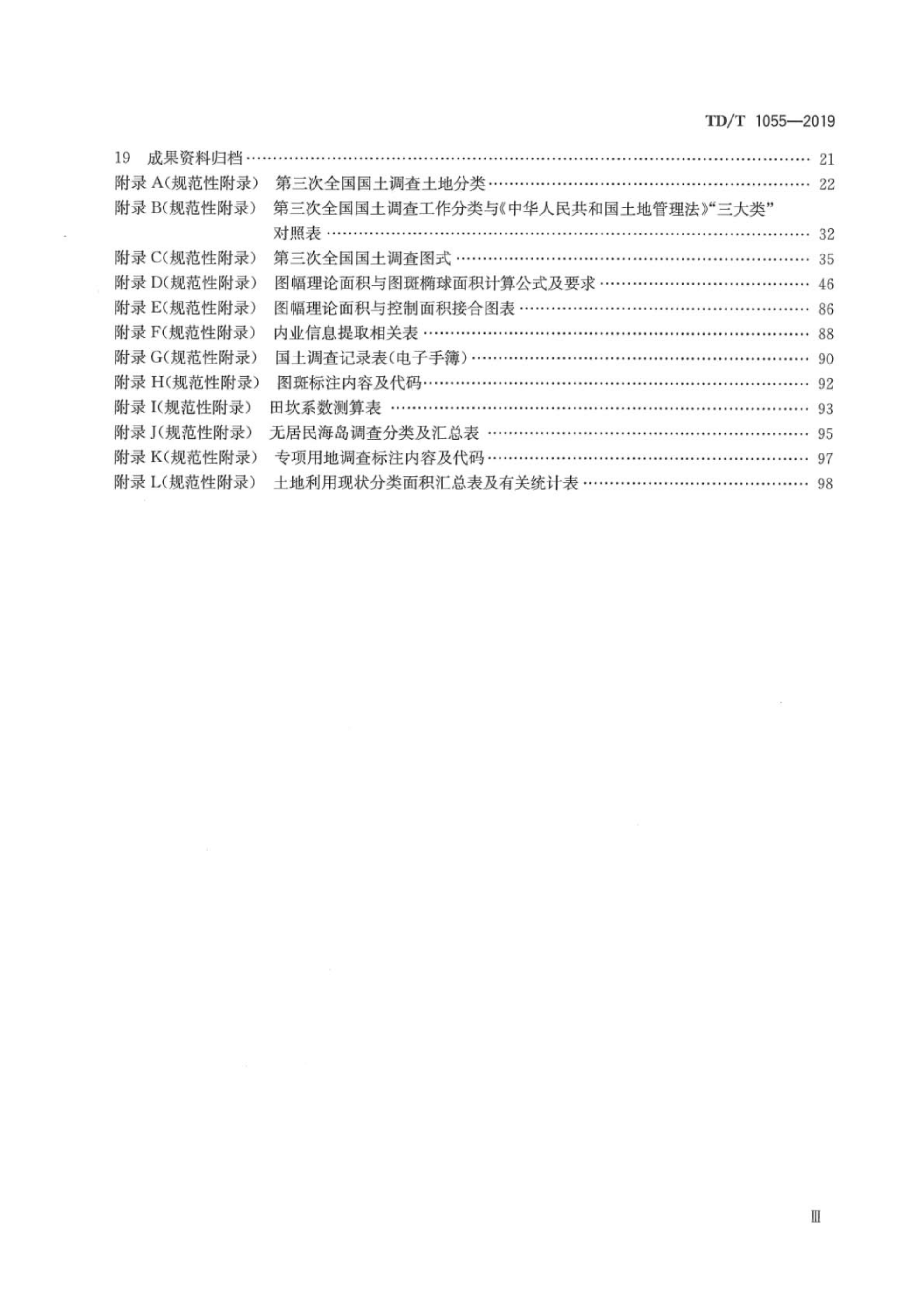 TD/T 1055—2019《第三次全国国土调查技术规程》 为自然资源行业技术标准,2019 年 2 月 1 日正式实施。规程作为 “三调” 核心技术依据,衔接GB/T 21010-2017分类标准,明确调查总体原则、影像制作、内外业核查、权属调查、图斑精度、数据库建设、成果核查归档全流程技术规范自然资源部。采用 2000 国家大地坐标系,细化遥感分辨率、最小上图面积等精度指标,严格以实地现状开展地类认定、图斑核查与举证。统一全国调查技术口径,保障三调底数底图底版权威精准,同时支撑年度国土变更调查、地类核查、耕地保护及国土空间规划管理工作云南省自然资源厅。