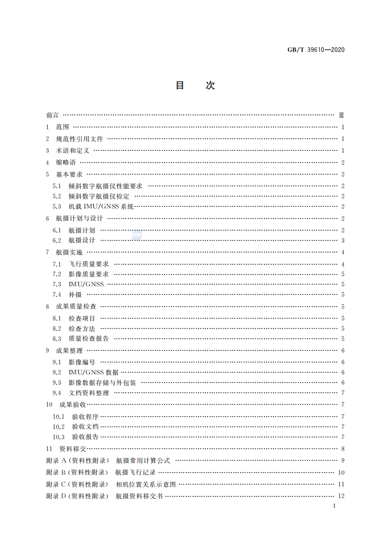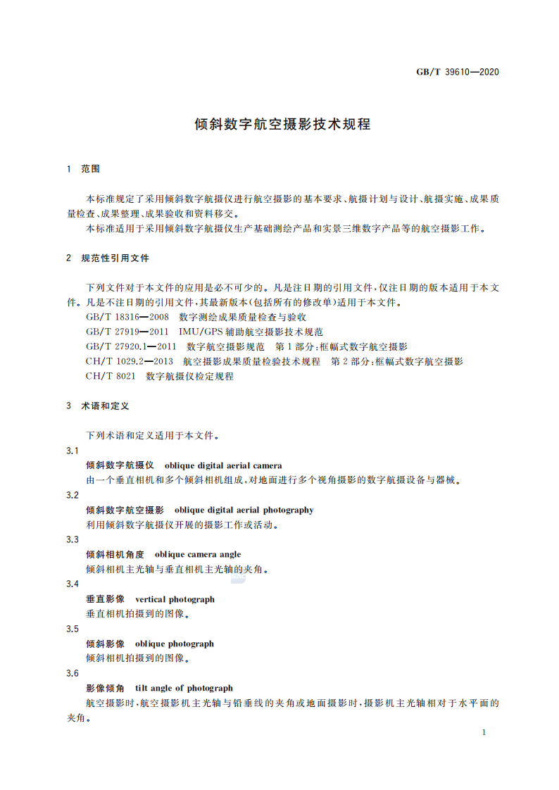 GBT 39610-2020倾斜数字航空摄影技术规程是 2020 年 12 月 14 日发布并同日实施的推荐性国家标准国家标准化管理委员会,由自然资源部主管、全国地理信息标准化技术委员会归口全国标准信息公共服务平台。本规程统一规范倾斜数字航空摄影全流程技术要求,涵盖基本规定、航摄计划与设计、航摄实施、成果质量检查、整理验收及资料移交等环节。明确倾斜航摄仪、IMU/GNSS 系统性能与检定要求,细化飞行参数、影像质量、重叠度等关键指标。适用于基础测绘、实景三维建模等航空摄影作业,为倾斜摄影数据生产提供统一技术标尺,有效提升成果精度、质量与兼容性,支撑国土、规划、智慧城市等领域数字化应用。